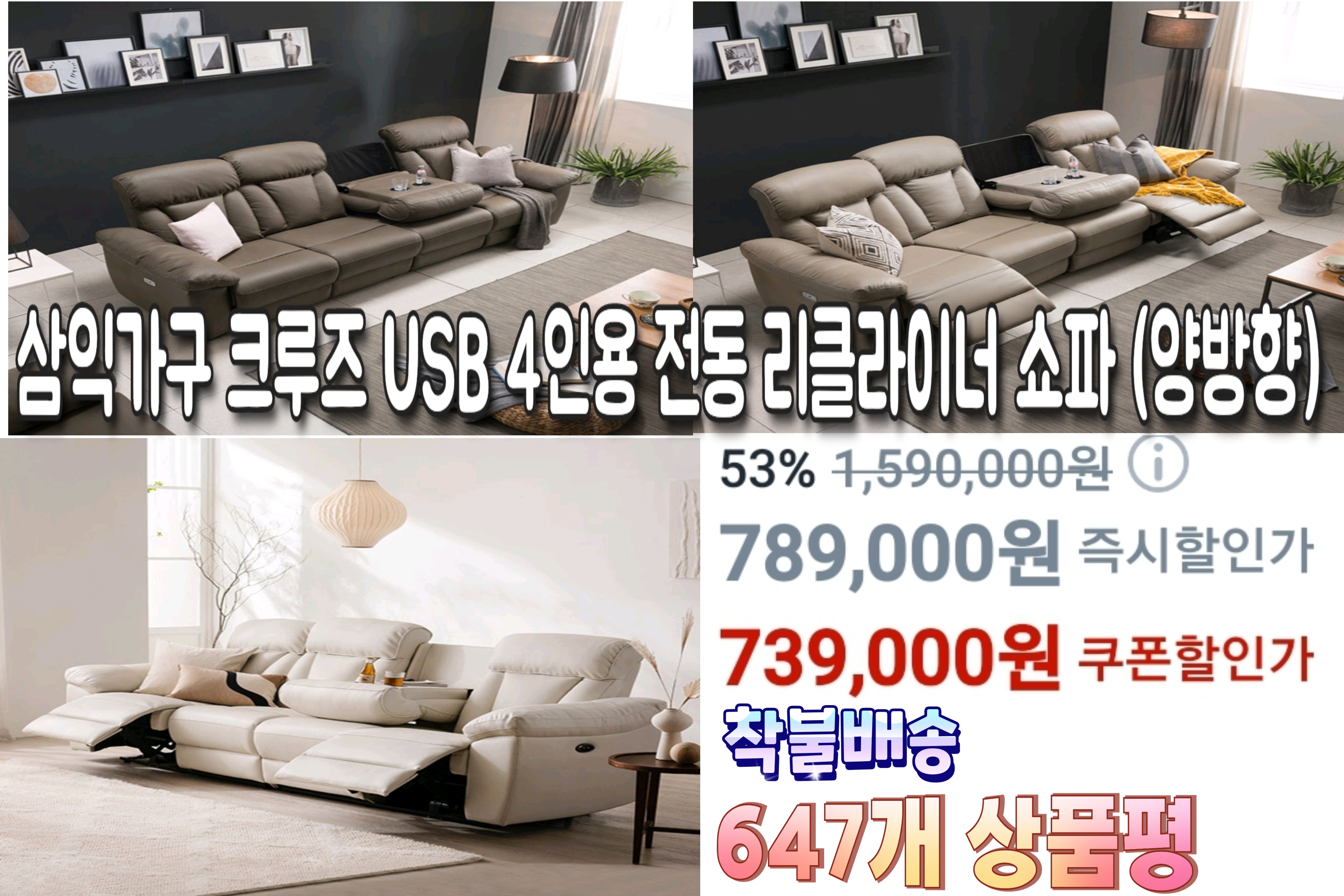 [삼익가구] 크루즈 USB 4인용 전동 리클라이너 가죽소파 쇼파(양방향)