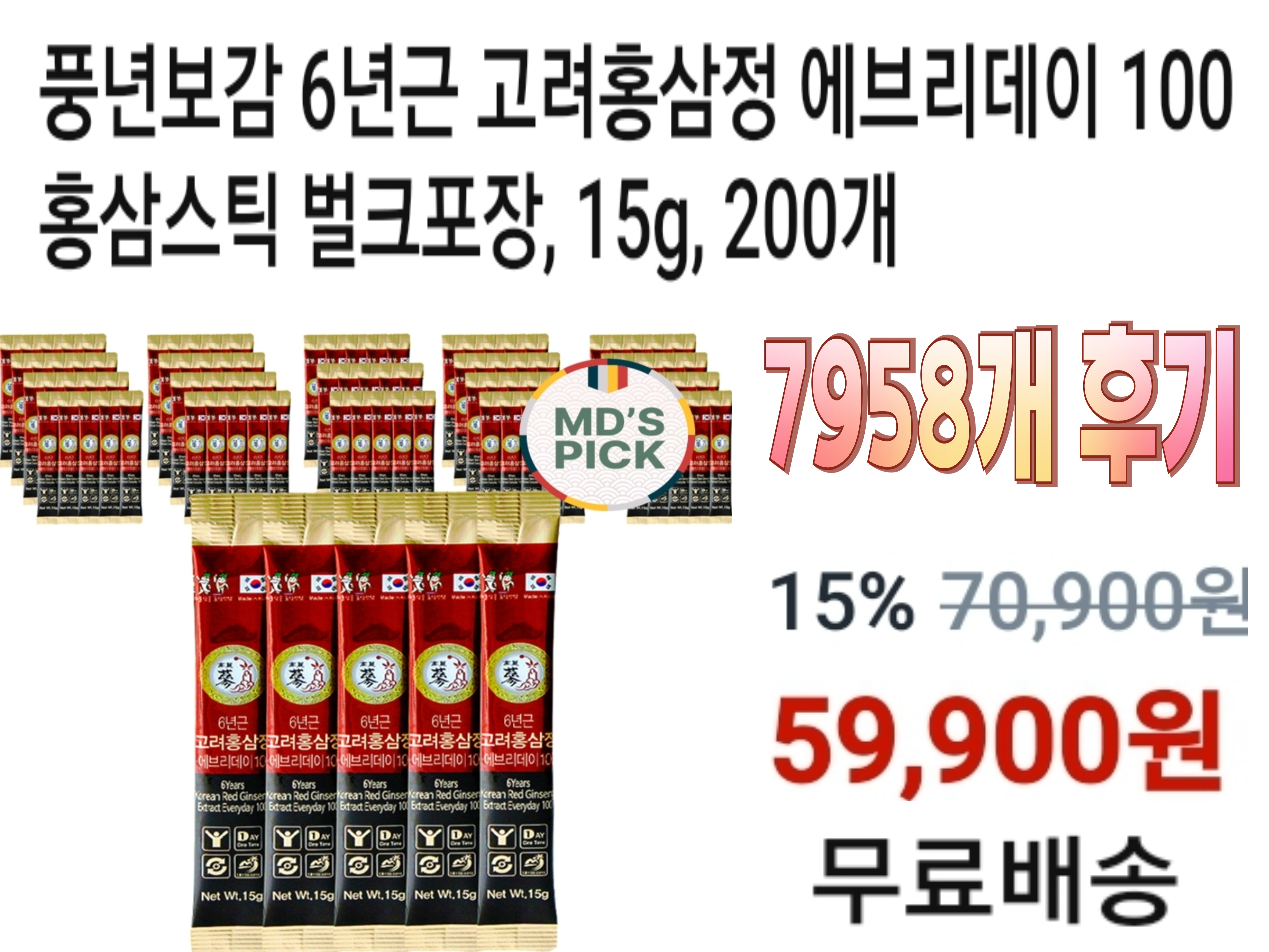 풍년보감 6년근 고려홍삼정 에브리데이 100 홍삼스틱 벌크포장 15g, 100개