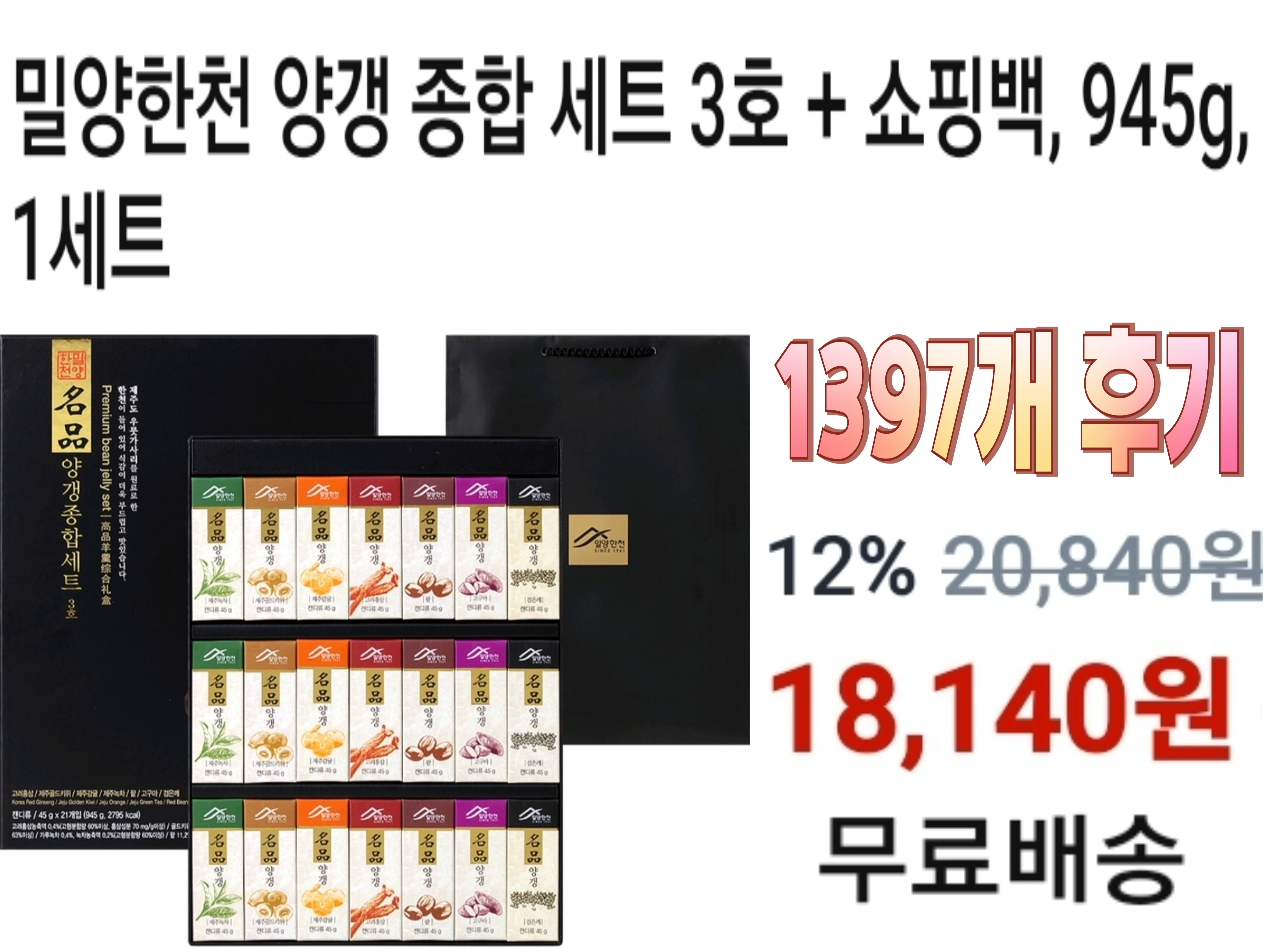 밀양한천 양갱 종합 세트 3호 + 쇼핑백 1세트, 945g