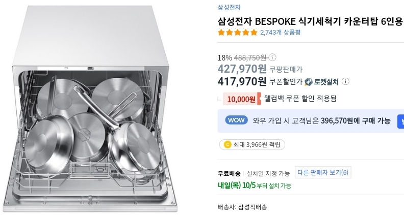 ♣삼성전자 비스포크 식기세척기 카운터탑 6인용♣